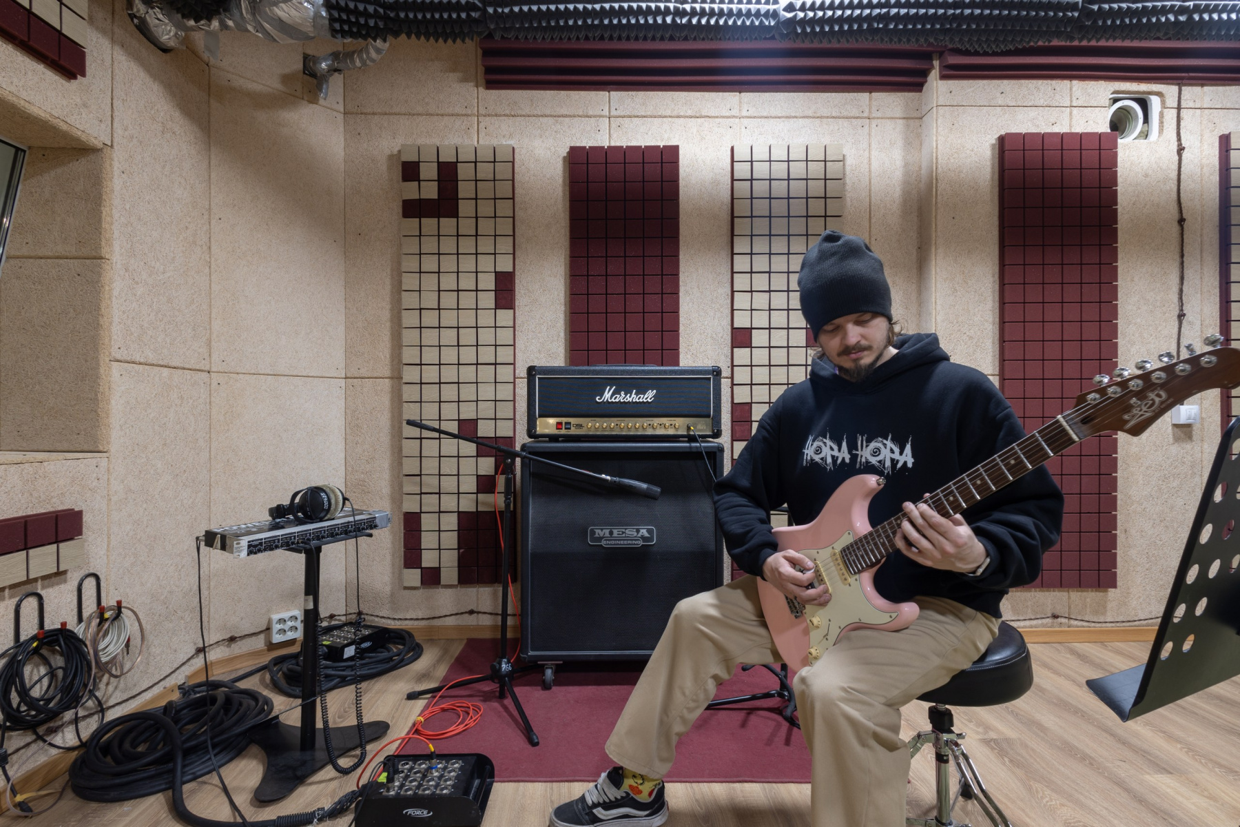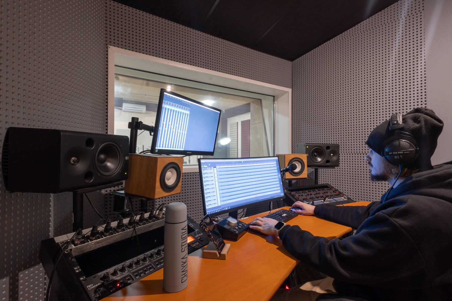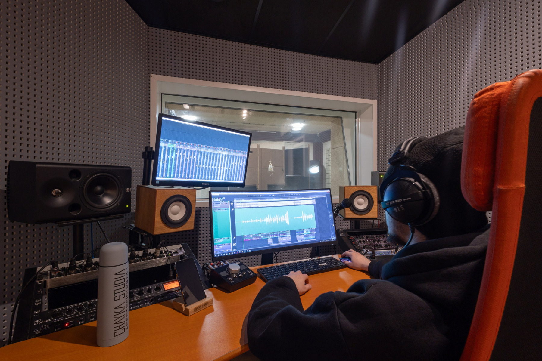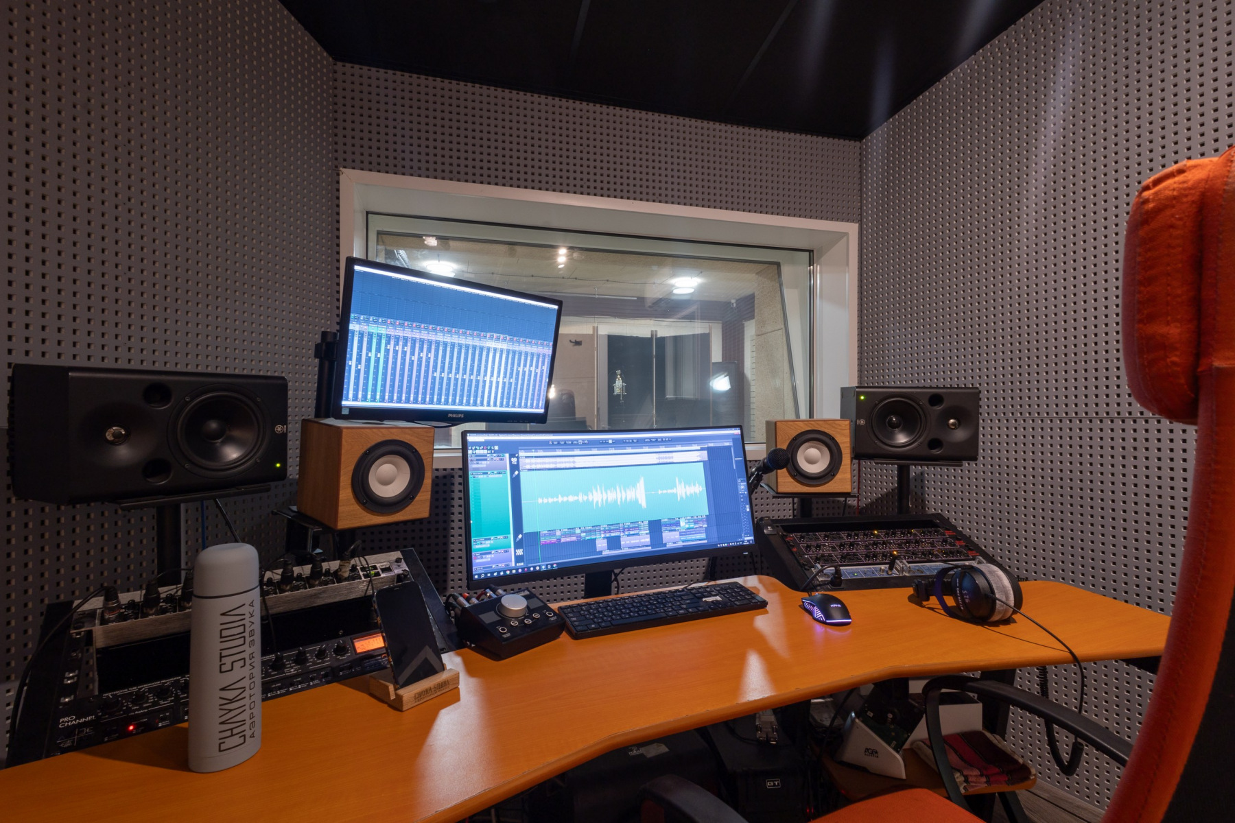 Студия звукозаписи - состоит из полноценного Тон-зала 27 м2 и контрольной комнаты 13 м2.