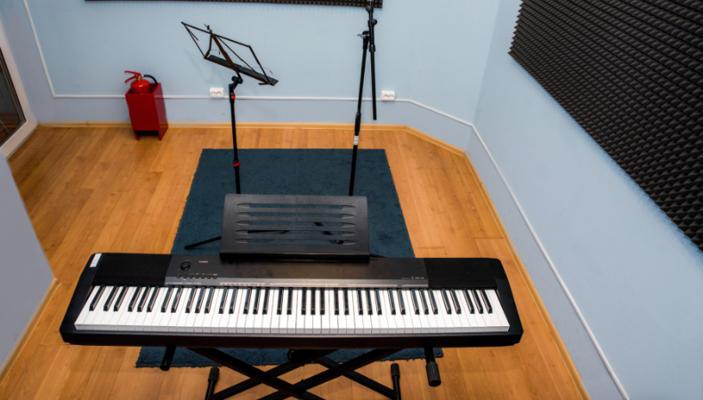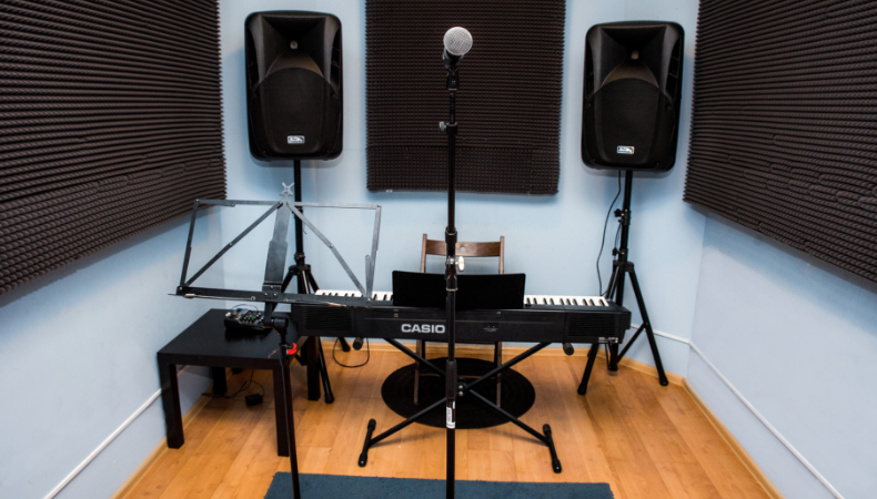 Во всех вокальных классах мы подготовили все необходимое: синтезатор, микрофон, микшерный пульт, вся необходимая коммутация для подключения минусовок с телефонов, компьютеров и планшетов, зеркало.