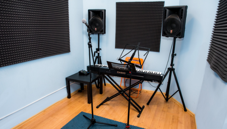 Во всех вокальных классах мы подготовили все необходимое: синтезатор, микрофон, микшерный пульт, вся необходимая коммутация для подключения минусовок с телефонов, компьютеров и планшетов, зеркало.